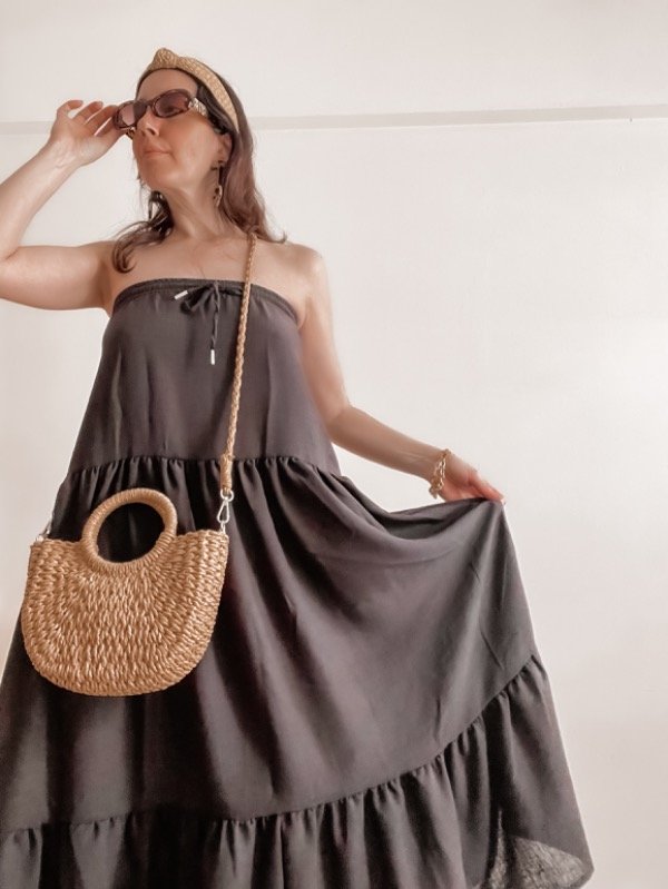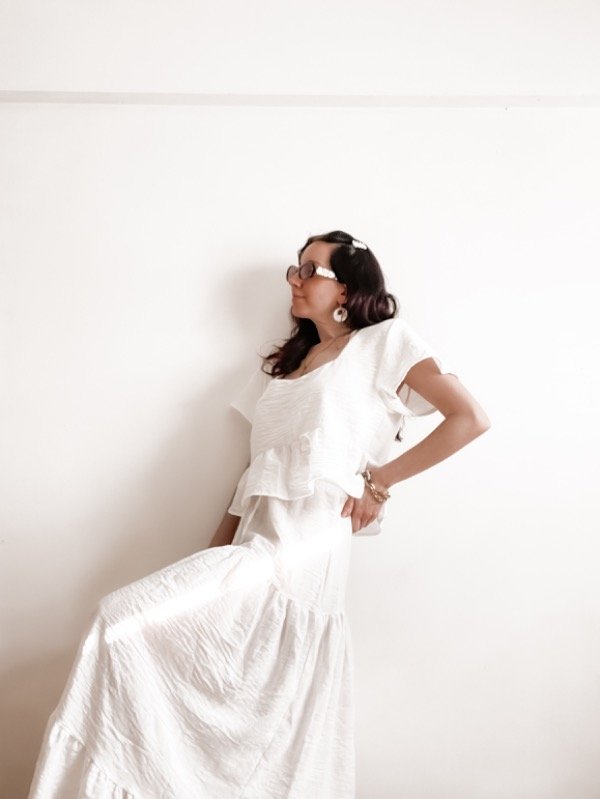Maxi falda / vestido strapless confeccionado en lino madrileño con detalle de recortes y cordón al frente