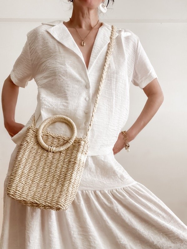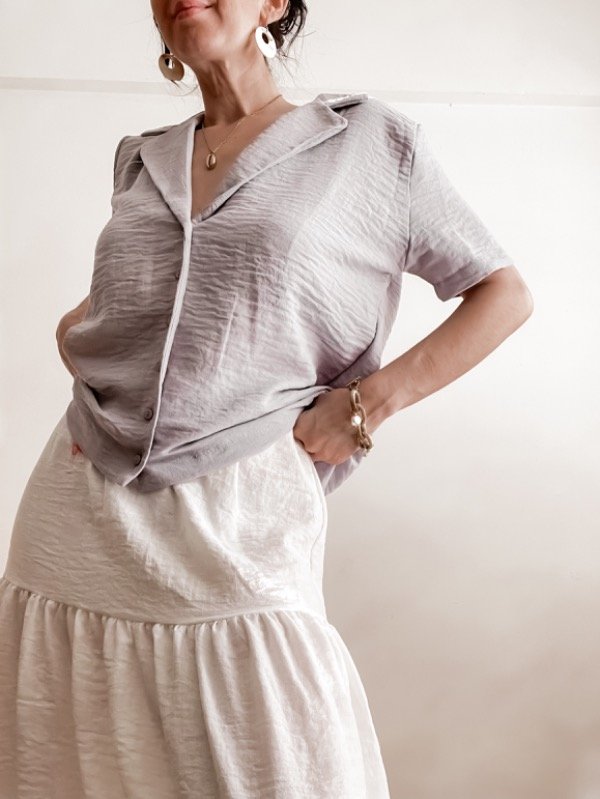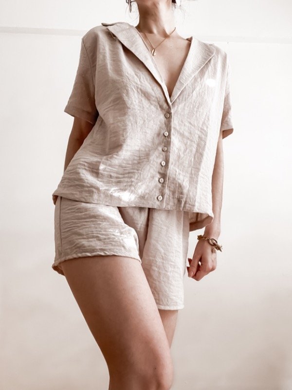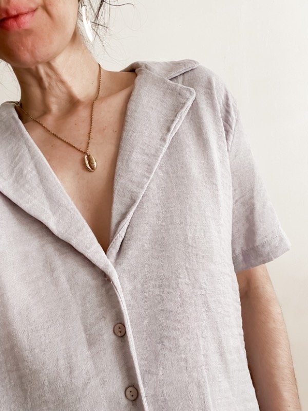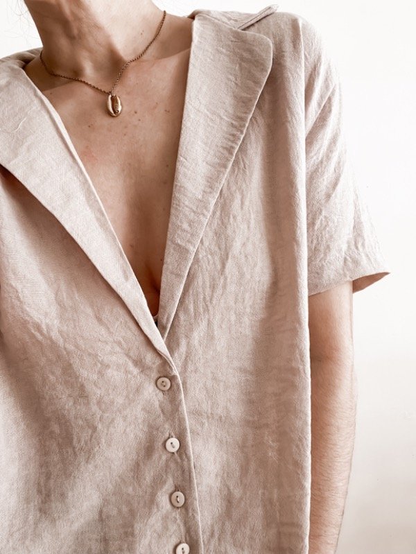 Camisa confeccionada en lino madrileño con cuello en V escotada y botones a tono
