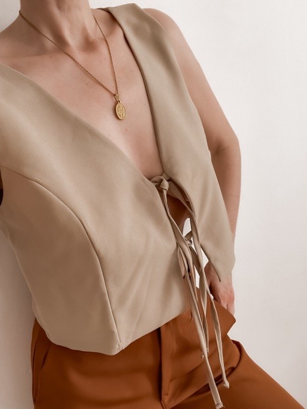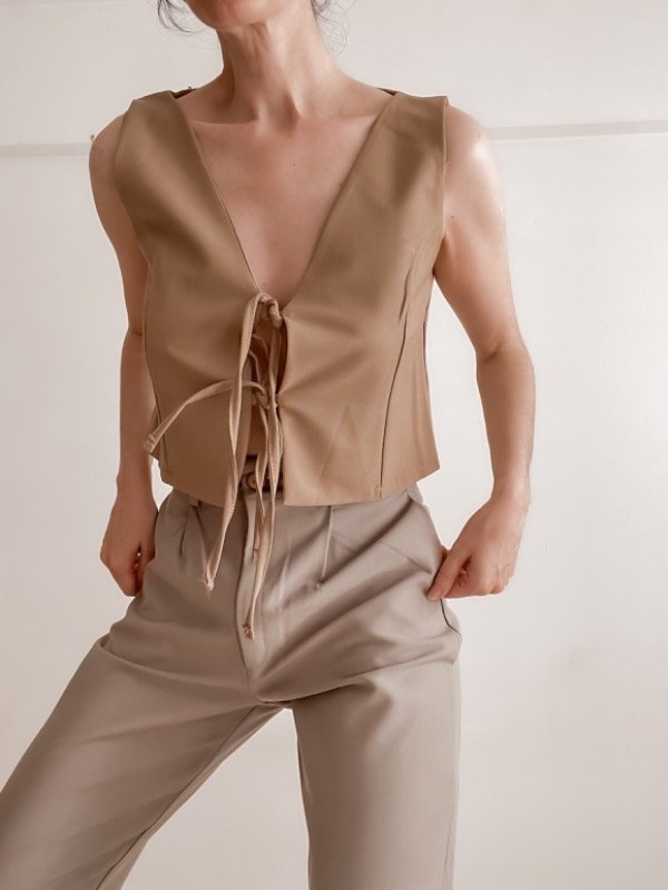 Chaleco crop sastrero corte recto con lazos al frente para atar.