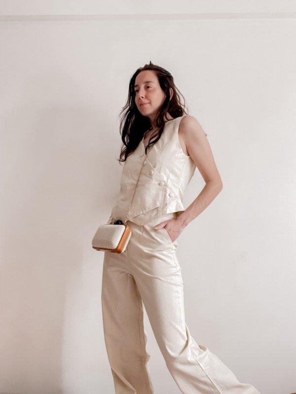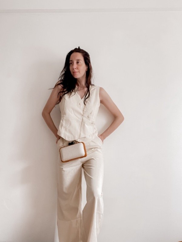 Set de lino sastrero compuesto por chaleco cruzado con botones forrados + pantalón tiro alto con bolsillos