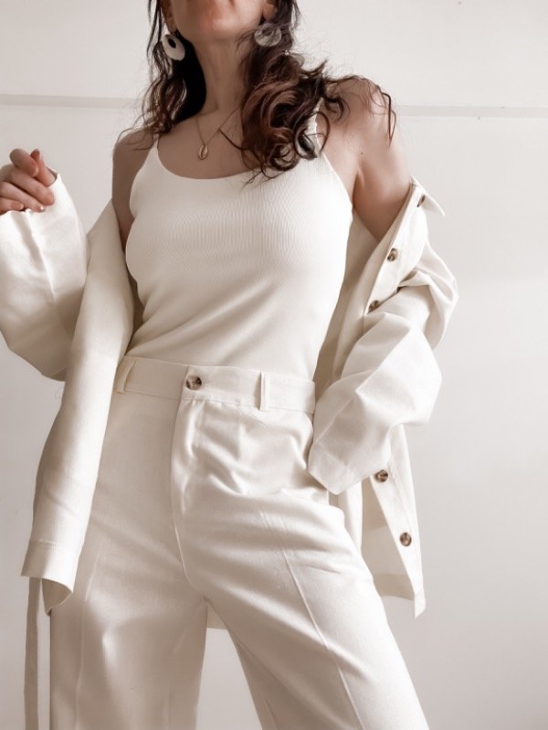 • Pantalón con cremallera y botón + bolsillos al frente.